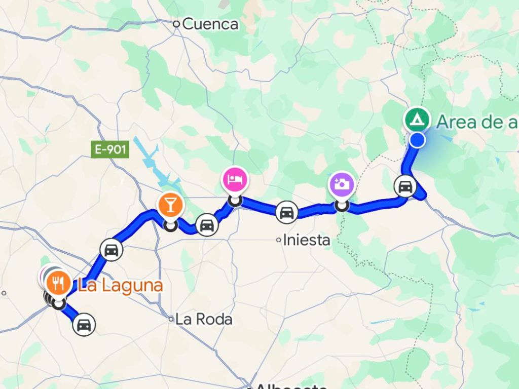 Vi kör 2 maskiner och torktumlar sedan. Vid 12-tiden är vi klara. Totalt kostnad 21€. Det finns en fågellokal bara 17 km bort, Dehesa de Santa Marta, som ser intressant ut. Vi kör dit men det gick inte att parkera med husbil så vi återvände till Villarrobledo och stannar vid en bensinmack där vi gör lunch i bilen. Fortsätter sedan till en kommunal ställplats i Motilla del Palancar, 8 mil bort som såg bra ut. Tar motorvägen och stannar vid en Repsol bensinmack efter motorvägen A-3 nära Tebar och tankar LPG gas 29,29 liter á 0,989€ = 28,97€. Framme vid Motilla del Palancar, strax före 15:00.