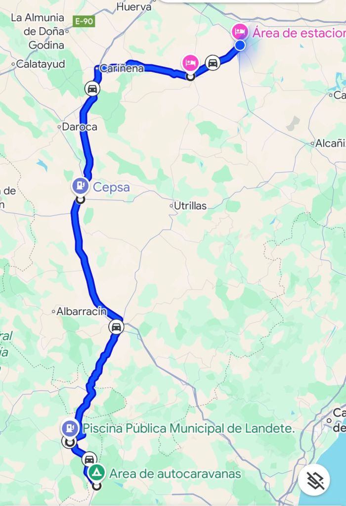 Han pratar bara spanska så det blev goggle translate. Vi kör till en verkstad för att ta reda på vad ny spegel kostar. 249€ fick vi besked om. Vi kom överens om att ta skadan på försäkring så vi fyller i skadeanmälan så får vi se hur det går. En timma tog detta och sedan fortsatte vi färden norrut. Kommer ut på motorvägen A23 och klockan blir 12:00 då vi stannar och tankar 68,19 liter diesel á 1,524€ = 103,92€ vid orten Caminreal efter motorvägen A23. Vi gör också lunch i bilen. Mycket växlande väder med några kraftiga regnskurar.