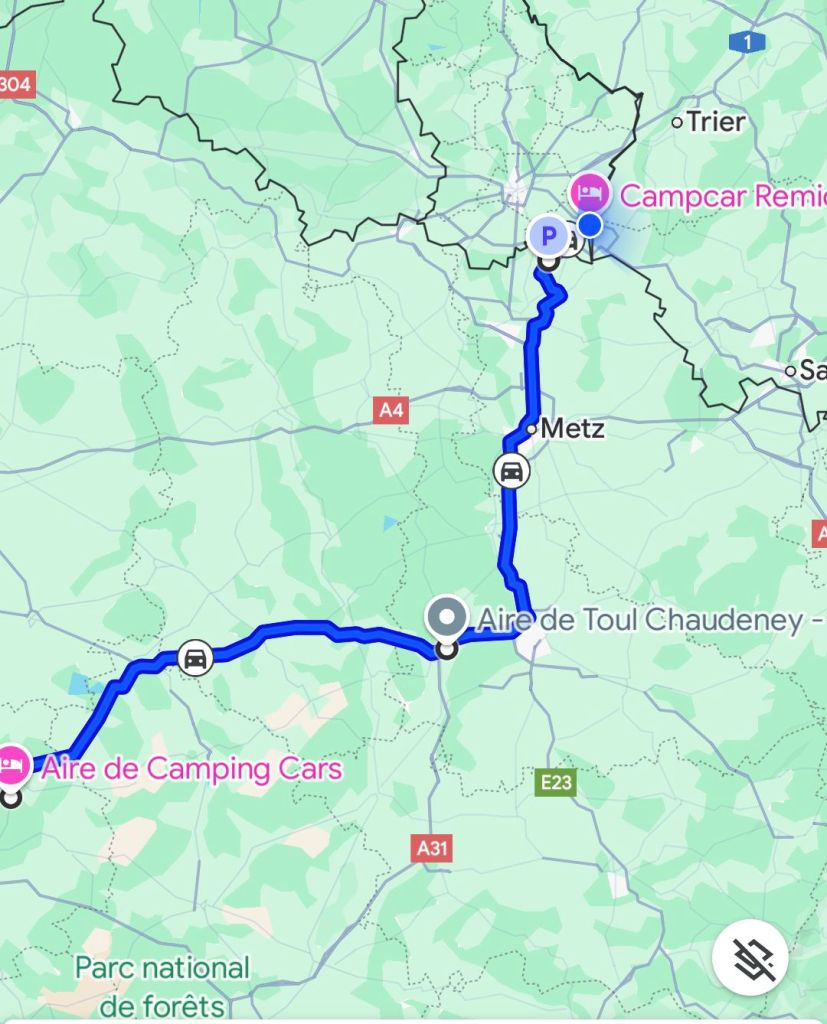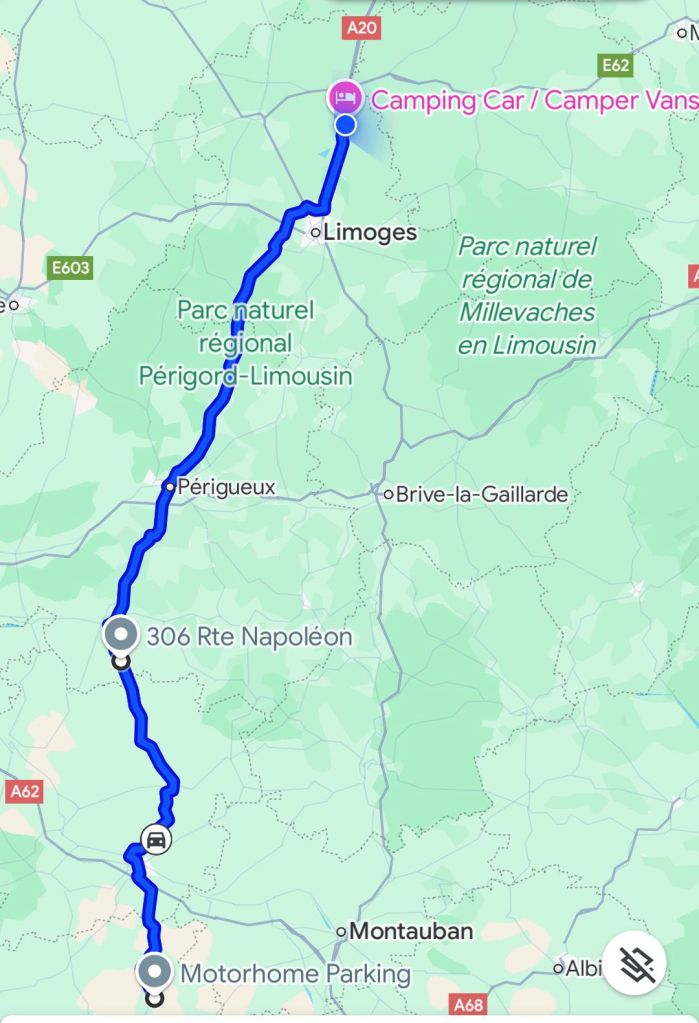 Mulen och kylig morgon igen. Kontaktar Folksam angående kollisionen häromdagen i Spanien. Jag får sedan ett ärendenummer via Kivra och skall sända kompletterande handlingar. Lämnar den kommunala ställplatsen i Fleurance 09:30 och siktar på en ställplats i Bessines-sur-Gartempe omkring 30 mil norrut. Valde bort betalvägar så navigatorn väljer mindre vägar. Tanken är att följa N21 som går i rätt riktning nästan ända fram. Navigatorn vill dock ta genvägar så det blir lite struligt att hitta emellanåt.