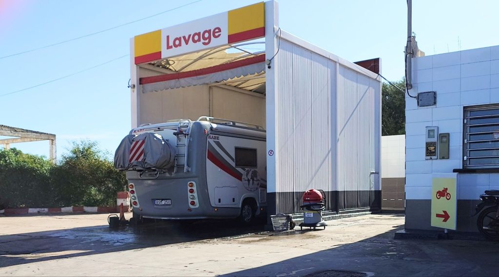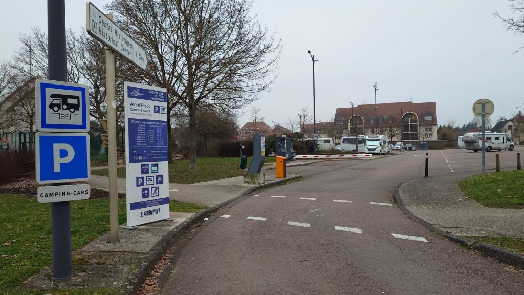 Det fungerar bra förutom en liten felkörning. Strax före 12:00 stannar vi vid Wohnmobil Stellplatz Rdinger-Eller och gör lunch i bilen. Solen glimtar till ibland och då blir det varmt, men mest mulet och kyligt vind.