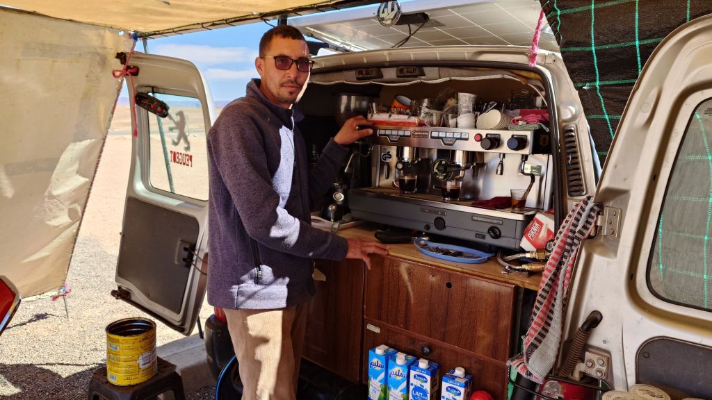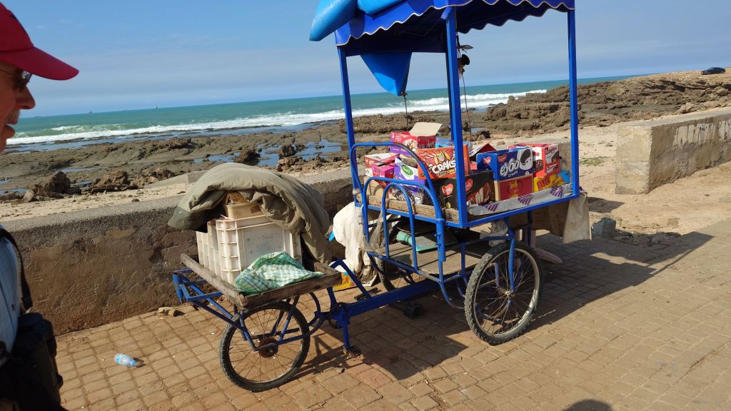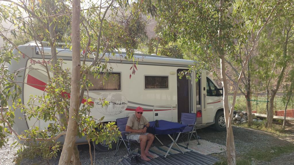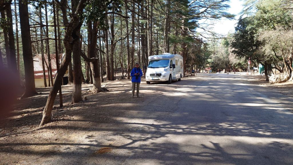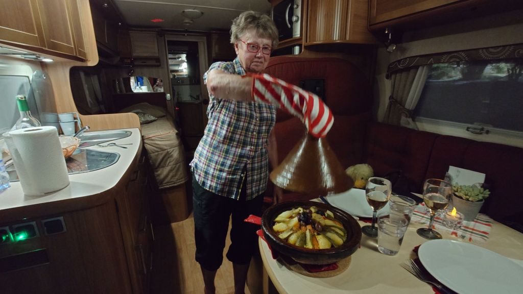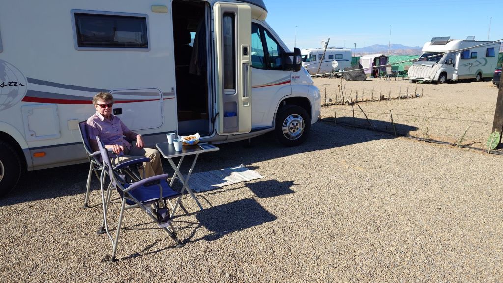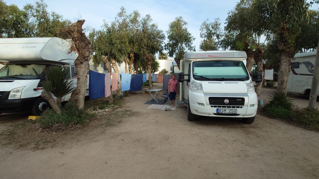 Framme 15:00 så vi gör trekaffet i bilen. Det har klarnat upp och solen skiner nu från molnfri himmel. Det är fortfarande kyligt i vinden. En svensk husbil parkerar vid sidan av oss. Det visar sig att dom också åker med samma färja som vi i morgon bitti som avgår 08:45.