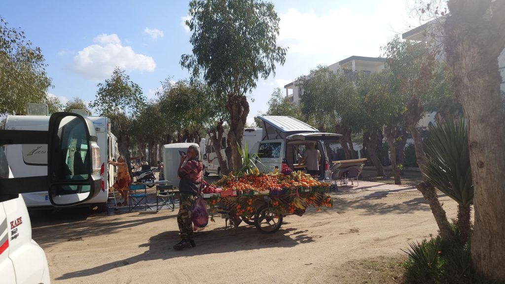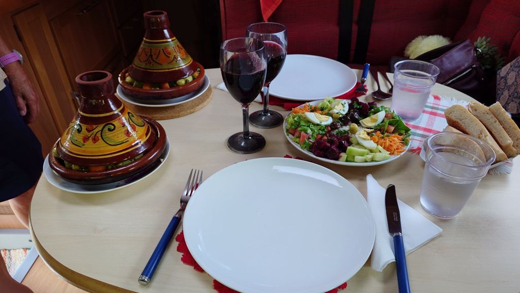 En regnskur kom och jag tog skydd under ett stort lövträd. Åter vid husbilen så klarnar det upp och blir riktigt varmt i solen. Vi satt ute i solen innan vi 18:00 går och handlar av vingårdens vin. Vi fick provsmaka och köper 3 lådor á 6 flaskor, vitt, rött och rosé. 5€ per flaska för rött o vitt samt 6€ för rosé. Betalar också ställplatsavgiften på 15€ inklusive el. Middag i bilen med en extra flaska vitt och nyheter på TV:n.